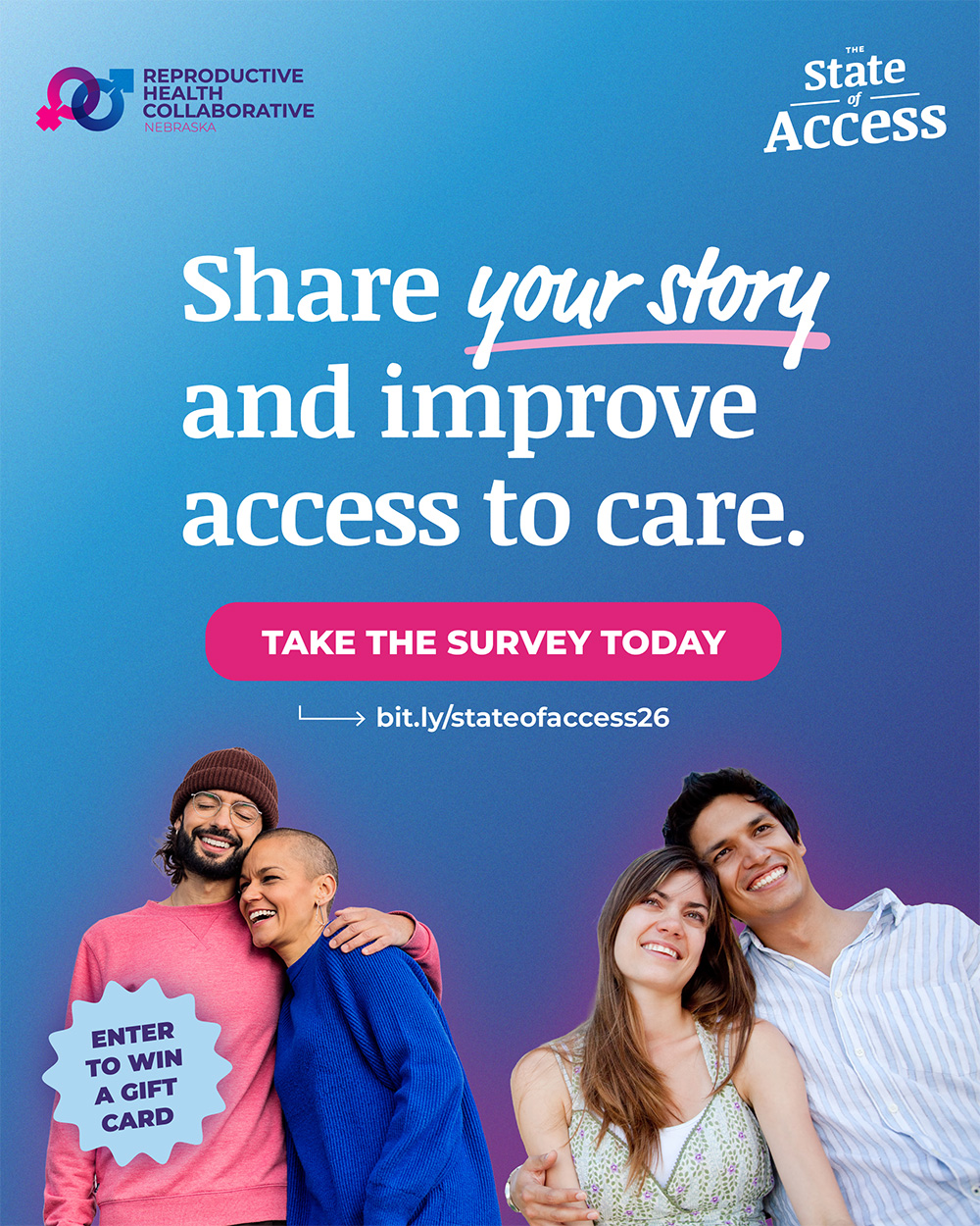 Your experience is powerful. By completing a brief survey, you can take action to improve reproductive healthcare access and education in Nebraska—and enter a raffle to win a gift card up to $100 in value!